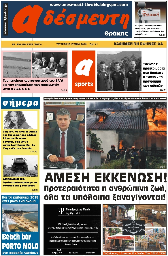 ΠΡΩΤΟΣΕΛΙΔΟ ΤΕΤΑΡΤΗ 25 ΙΟΥΛΙΟΥ 2018