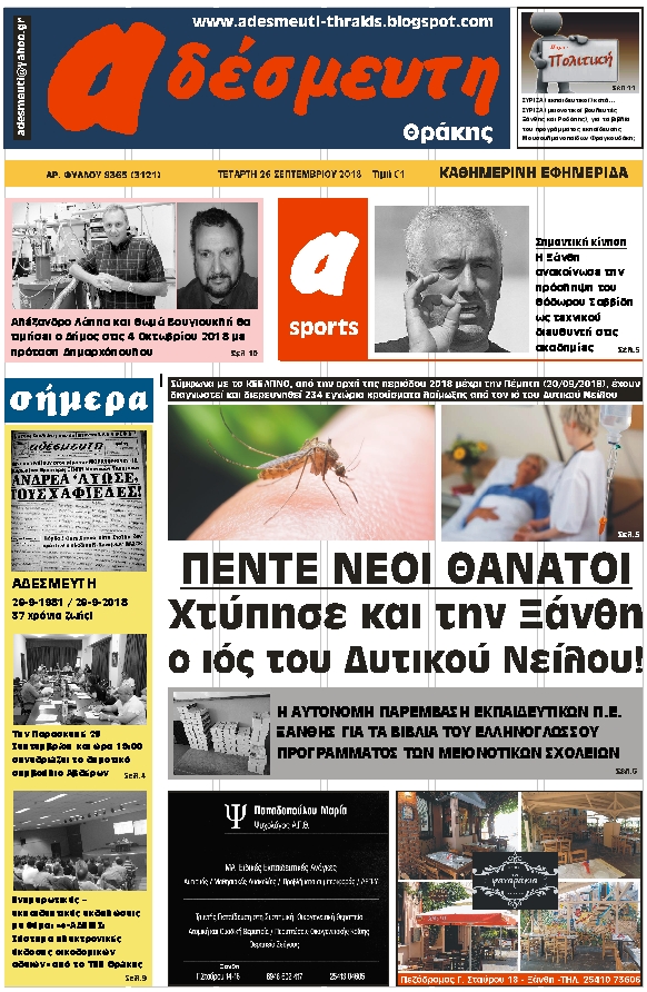 ΠΡΩΤΟΣΕΛΙΔΟ ΤΕΤΑΡΤΗ 26 ΣΕΠΤΕΜΒΡΙΟΥ 2018