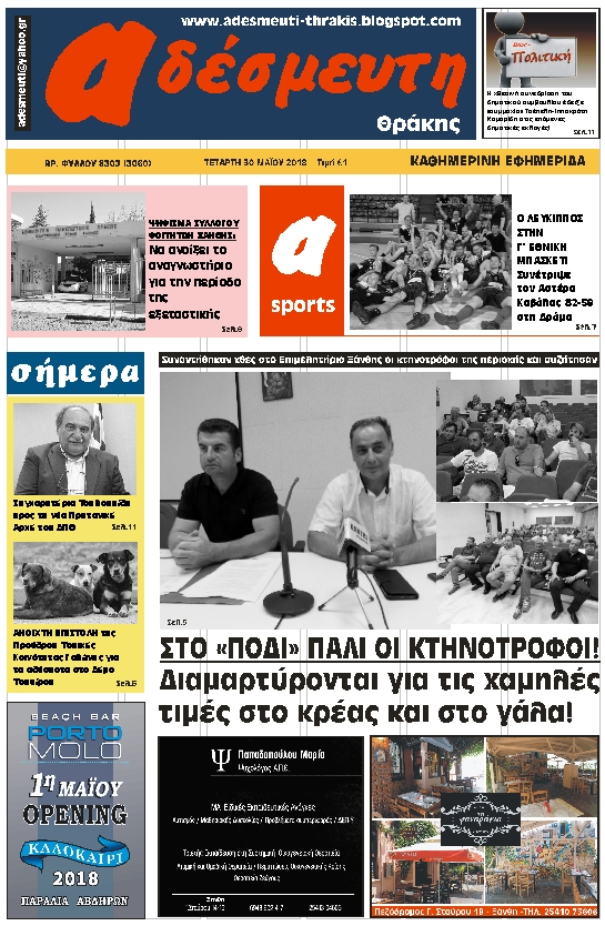 ΠΡΩΤΟΣΕΛΙΔΟ ΤΕΤΑΡΤΗ 30 ΜΑΙΟΥ 2018