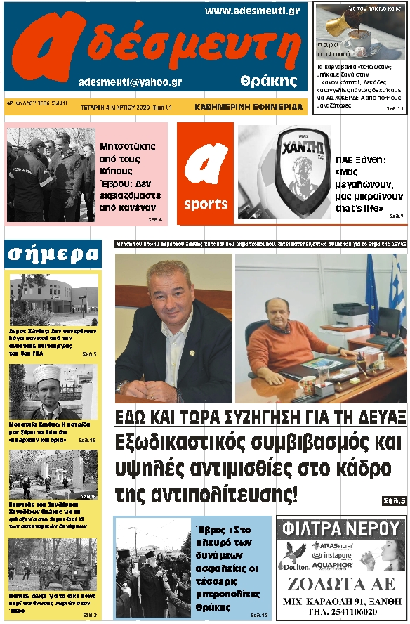 ΠΡΩΤΟΣΕΛΙΔΟ ΤΕΤΑΡΤΗ 4 ΜΑΡΤΙΟΥ 2020