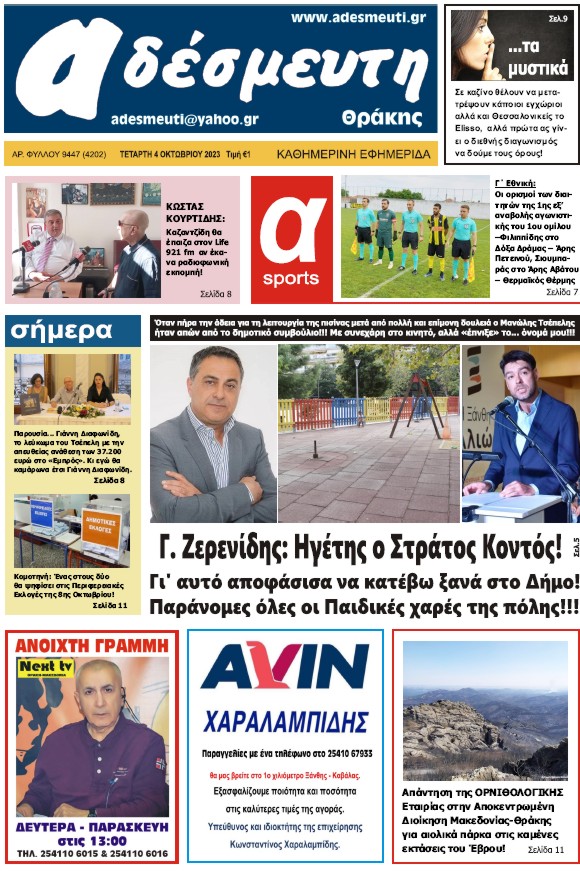 ΠΡΩΤΟΣΕΛΙΔΟ ΤΕΤΑΡΤΗ 4 ΟΚΤΩΒΡΙΟΥ 2023