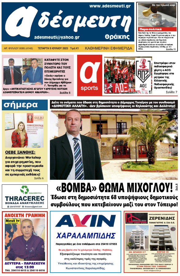 ΠΡΩΤΟΣΕΛΙΔΟ ΤΕΤΑΡΤΗ 5 ΙΟΥΛΙΟΥ 2023