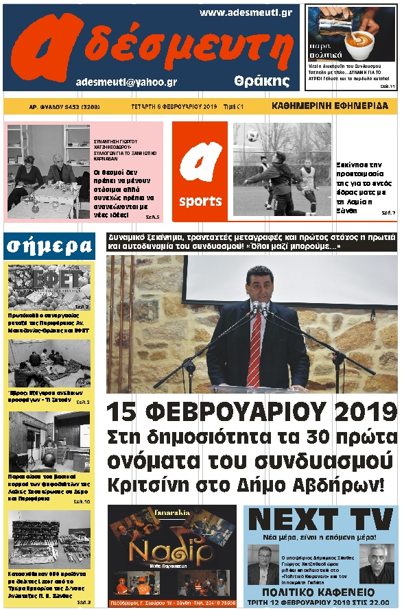 ΠΡΩΤΟΣΕΛΙΔΟ ΤΕΤΑΡΤΗ 6 ΦΕΒΡΟΥΑΡΙΟΥ 2019