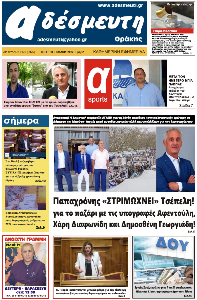 ΠΡΩΤΟΣΕΛΙΔΟ ΤΕΤΑΡΤΗ 6 ΙΟΥΛΙΟΥ 2022