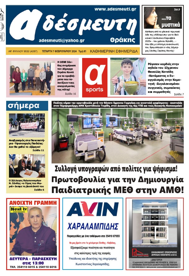 ΠΡΩΤΟΣΕΛΙΔΟ ΤΕΤΑΡΤΗ 7 ΦΕΒΡΟΥΑΡΙΟΥ 2024