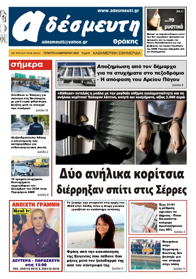 ΠΡΩΤΟΣΕΛΙΔΟ ΤΕΤΑΡΤΗ 8 ΙΑΝΟΥΑΡΙΟΥ 2025