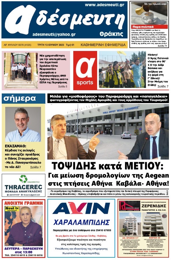 ΠΡΩΤΟΣΕΛΙΔΟ ΤΡΙΤΗ 13 ΙΟΥΝΙΟΥ 2023