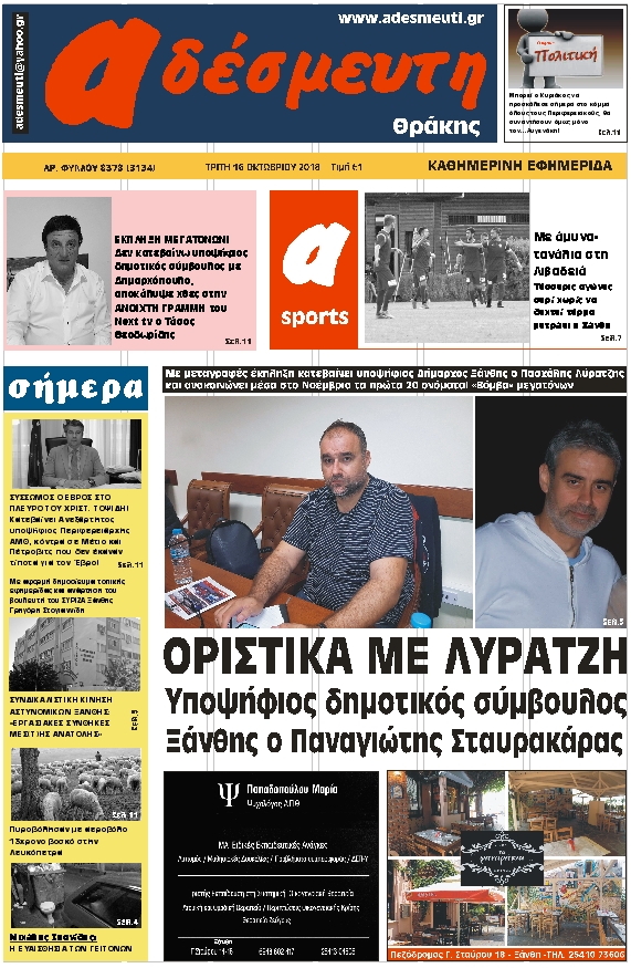 ΠΡΩΤΟΣΕΛΙΔΟ ΤΡΙΤΗ 16 ΟΚΤΩΒΡΙΟΥ 2018