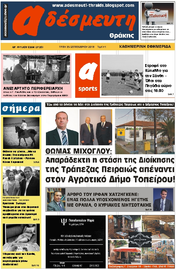 ΠΡΩΤΟΣΕΛΙΔΟ ΤΡΙΤΗ 25 ΣΕΠΤΕΜΒΡΙΟΥ 2018