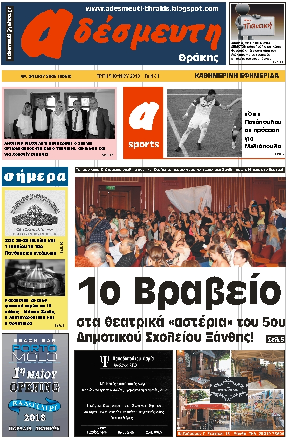 ΠΡΩΤΟΣΕΛΙΔΟ ΤΡΙΤΗ 5 ΜΑΙΟΥ 2018