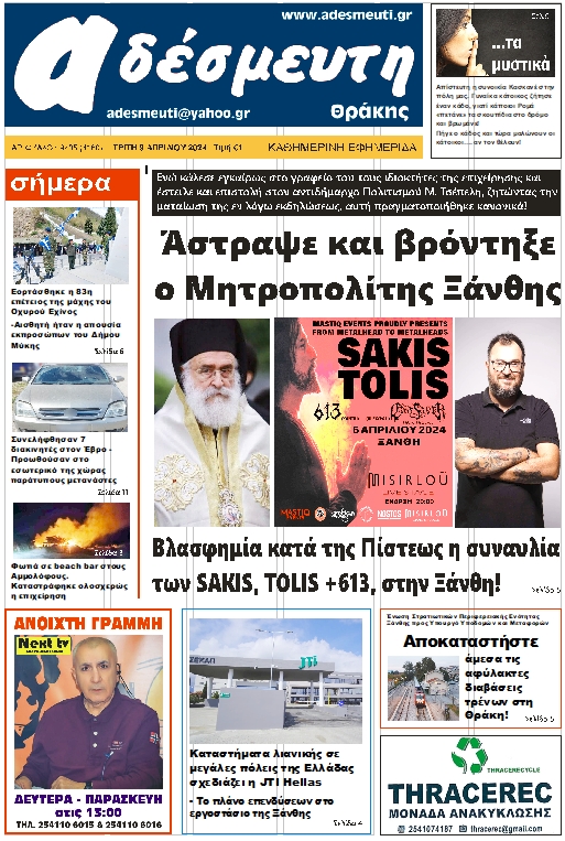 ΠΡΩΤΟΣΕΛΙΔΟ ΤΡΙΤΗ 9 ΑΠΡΙΛΙΟΥ 2024