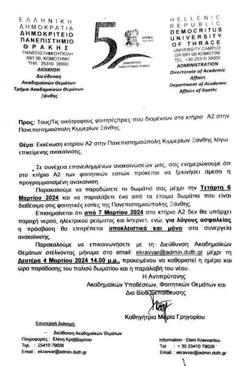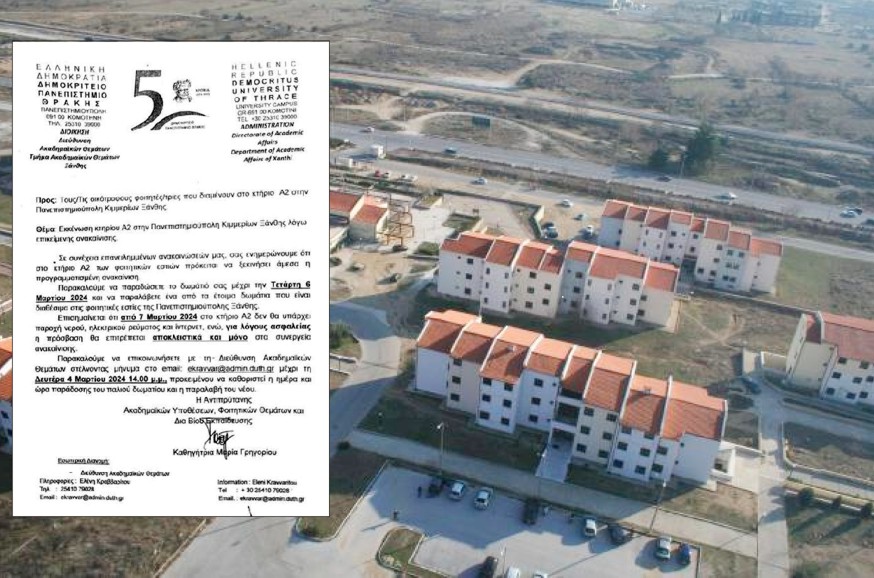 «Οι φοιτητές του κτιρίου Α2 των φοιτητικών εστιών Ξάνθης ενημερωθήκαμε στις 1/3/24 ότι σε διάστημα 5 ημερών θα πρέπει να φύγουμε από τα δωμάτιά μας και να εκκενώσουμε το κτίριο (Συνημμένο 1).
