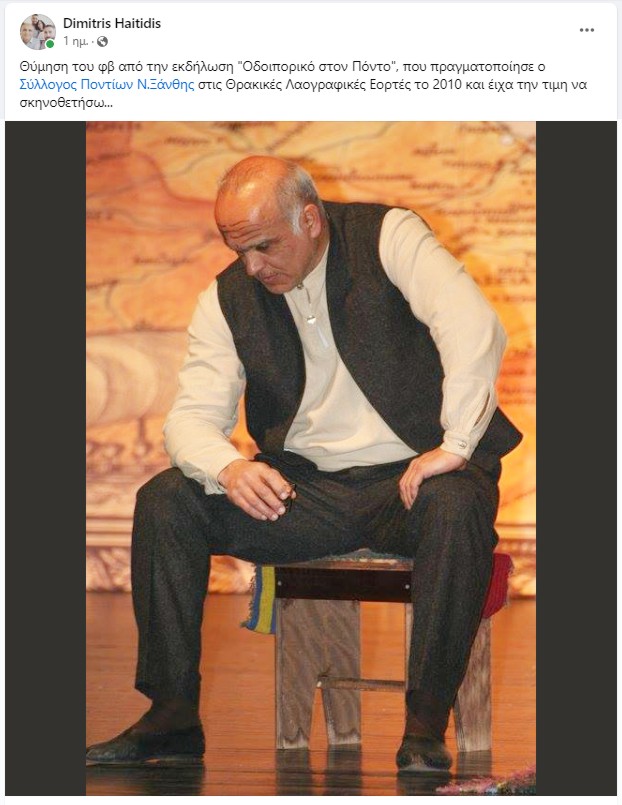 «Θύμηση του φβ από την εκδήλωση “Οδοιπορικό στον Πόντο”, που πραγματοποίησε ο Σύλλογος Ποντίων Ν.Ξάνθης στις Θρακικές Λαογραφικές Εορτές το 2010 και είχα την τιμή να σκηνοθετήσω».