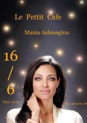 «Παρασκευή 16 Ιουνίου σας περιμένουμε στον εξωτερικό χώρο του Le petit cafe να περάσουμε μια όμορφη μουσική βραδιά με την μαγευτική Mania Aslanoglou‼ ώρα έναρξης 8:30 τηλ κρατήσεων 2541070745».
