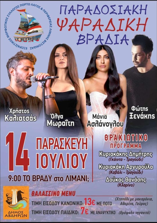 «Όλα είναι έτοιμα λοιπόν. Σας προσκαλούμε και σας περιμένουμε όλους και όλες, μεγάλους και μικρούς σε μια ΨΑΡΑΔΙΚΗ ΒΡΑΔΙΑ χωρίς προηγούμενο. Φουλ παραδοσιακό θρακιώτικο νησιώτικο και φυσικά λαϊκό πρόγραμμα με 7 καλλιτέχνες και την ορχήστρα που θα απογειώσουν το κέφι και φυσικά άφθονο χταπόδι και ψιλό ψαράκι που βγάζει ο τόπος μας, το πανέμορφο και ευλογημένο ΠΟΡΤΟ-ΛΑΓΟΣ» σημειώνει στο κάλεσμά του ο Εξωραϊστικός Μορφωτικός Σύλλογος Πόρτο-Λάγος.