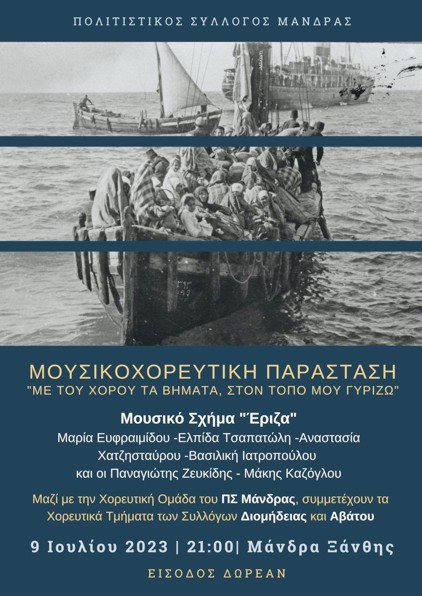 Η Χορευτική Ομάδα του Πολιτιστικού Συλλόγου Μάνδρας σε συνεργασία με τα Χορευτικά Τμήματα των Πολιτιστικών Συλλόγων Διομήδειας και Αβάτου, και φυσικά με το μοναδικό Μουσικό Σχήμα “Έριζα”, παρουσιάζουν μια ξεχωριστή μουσικοχορευτική Παράσταση για τα 100 χρόνια από την Υπογραφή της Συνθήκης της Λωζάνης.
