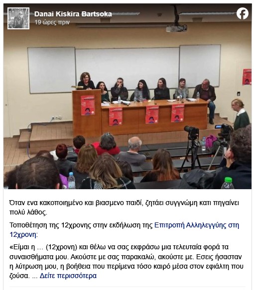 *Συγκλονίζουν τα λόγια της 12χρονης από τον Κολωνό, η οποία έλυσε την σιωπή της μέσω επιστολής την οποία ανέγνωσε η μεγαλύτερη αδερφή της σε αμφιθέατρο της Νομικής Σχολής του ΕΚΠΑ, στη διάρκεια εκδήλωσης που διοργάνωσε η Επιτροπή Αλληλεγγύης για το μικρό κορίτσι και την οικογένειά του.
