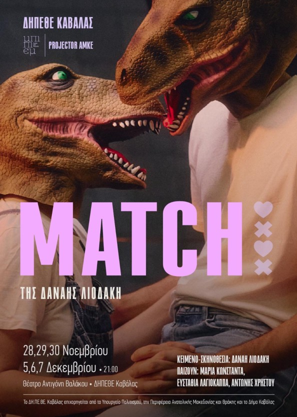 *Το «Match», μια σκληρή κωμωδία για το τέλος του έρωτα, προσεγγίζει με χιούμορ και ευαισθησία τις ρομαντικές σχέσεις, και θέτει το ερώτημα: πώς ο έρωτας θα ξεπεράσει εμπόδια όπως ο ατομισμός, ο καταναλωτισμός, η αβεβαιότητα των πολλαπλών επιλογών και θα επιβιώσει σε μια κοινωνία που όλα φαίνεται να είναι εναντίον του;