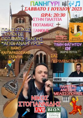 Πρόσκληση «Ο ΠΟΛΙΤΙΣΤΙΚΟΣ ΣΥΛΛΟΓΟΣ ΠΟΤΑΜΙΑΣ ΞΑΝΘΗΣ “ΑΓΙΟΙ ΑΝΑΡΓΥΡΟΙ” ΣΑΣ ΠΡΟΣΚΑΛΕΙ ΣΤΟ ΛΑΪΚΟ ΚΑΙ ΠΑΡΑΔΟΣΙΑΚΟ ΓΛΕΝΤΙ ΤΟ ΣΑΒΒΑΤΟ 1 ΙΟΥΛΙΟΥ 2023, ΩΡΑ 20:30 ΣΤΗΝ ΠΛΑΤΕΙΑ ΠΟΤΑΜΙΑΣ ΞΑΝΘΗΣ.