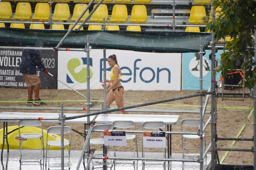 *Υπό βροχή έπαιζαν χθες οι αθλήτριες στο beach volley της πλατείας. Και οι κερκίδες φυσικά άδειες!