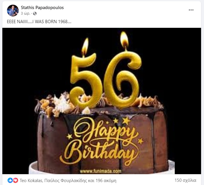 *56 χρονών έγινε χθες ο γνωστός αθλητικογράφος, ασφαλιστής και γενικά μέσα σε όλα Στάθης Παπαδόπουλος και τα γιόρτασε φυσικά με ανάλογη φωτογραφία και εκατοντάδες ευχές μέσα από το fb.