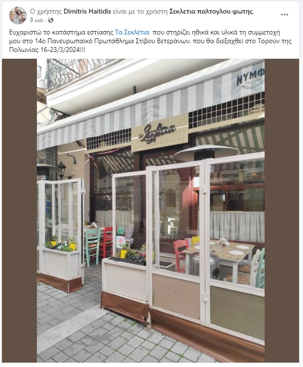 «Dimitris Haitidis. Ευχαριστώ το κατάστημα εστίασης Τα Σεκλέτια που στηρίζει ηθικά και υλικά τη συμμετοχή μου στο 14ο Πανευρωπαϊκό Πρωτάθλημα Στίβου Βετεράνων, που θα διεξαχθεί στο Τορούν της Πολωνίας 16-23/3/2024!!!