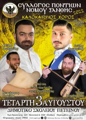 *Καλλιτεχνικό 1. O Σύλλογος Ποντίων Ν. Ξάνθης, την Τετάρτη 3 Αυγούστου στις 21:30 διοργανώνει στο Δημοτικό Σχολείο του Πετεινού τον «Καλοκαιρινό χορό 2022» με τους Πόντιους τραγουδιστές Αλέξη Παρχαρίδη και Στάθη Πορφυρίδη και τους μουσικούς, Χριστόφορο Κοσμίδη στην γκάιντα, Τάσο Πετρόπουλο στη Λύρα, Νίκο Τσεπίδη στο νταούλι και Χρήστο Κουνέλη στα πλήκτρα.
