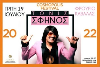 *Και κάτι διαφορετικό. Για πρώτη φορά ο δημοφιλής καλλιτέχνης Τόνι Σφήνος γνωστός για το πιο διασκεδαστικό και χορευτικό θέαμα που προσφέρει με τις αγαπημένες σε όλους επιτυχίες των δεκαετιών του Ά60 και Ά70, έρχεται για πρώτη φορά την Τρίτη 19 Ιουλίου στις 21:00 στην πόλη της Καβάλας στα πλαίσια του φεστιβάλ Cosmopolis. Μέσα από το αστείρευτο κέφι του Τόνι και την διαδραστικότητα που έχει με το κοινό θα απολαύσουμε ένα μουσικό ταξίδι μέχρι και τις επιτυχίες των ’90ς σ’ ένα αξέχαστο πάρτυ.