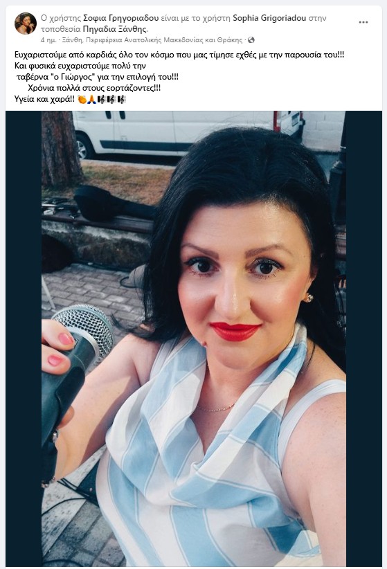 *Η τρομερή τραγουδίστρια Σοφία Γρηγοριάδου –εντυπωσίασε και στο Πικαντίλι του περασμένου Φλεβάρη 2024- ευχαρίστησε τους φίλους της για την εντυπωσιακή τους παρουσία στην εκδήλωση των Πηγαδίων με το παρακάτω ευχαριστήριο:
