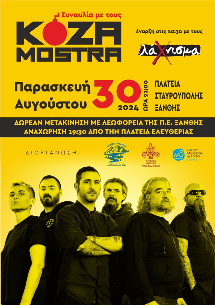 «Η Περιφερειακή Ενότητα Ξάνθης στα πλαίσια της δράσης «Νέστος – Ροδόπη, Περιβάλλον και Πολιτισμός 2024 διοργανώνει συναυλία με την Ροκ Μπάντα: «KOZA MOSTRA» την Παρασκευή 30 Αυγούστου 2024, στις 21:00 στην Πλατεία της Σταυρούπολης Ξάνθης.