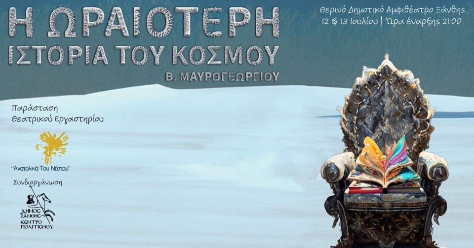 *Το θεατρικό εργαστήρι Ανατολικά του Νέστου, την Τετάρτη 12 και την Πέμπτη 13 Ιουλίου στις 21:00 παρουσιάζει στο υπαίθριο δημοτικό αμφιθέατρο Ξάνθης το υπέροχο έργο του Β. Μαυρογεωργίου «Η ωραιότερη ιστορία του κόσμου».