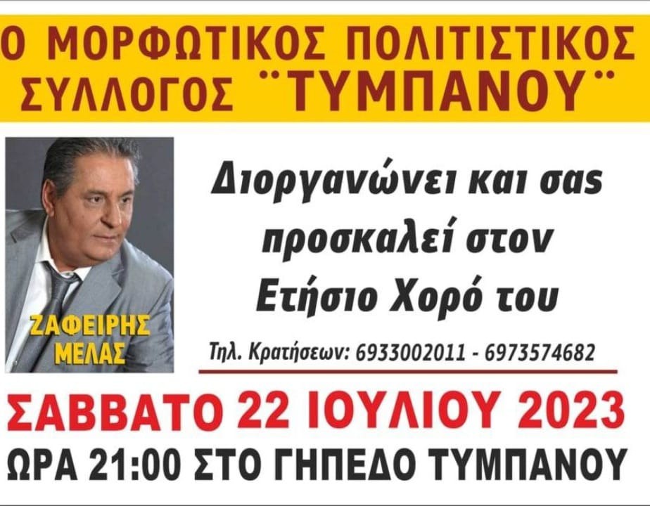 *Ο Μορφωτικός Πολιτιστικός Σύλλογος Τυμπάνου, σας προσκαλεί να διασκεδάσετε στον ετήσιο χορό του με τον Ζαφείρη Μελά το Σάββατο 22 Ιουλίου στις 21:00 στο γήπεδο του Τυμπάνου!