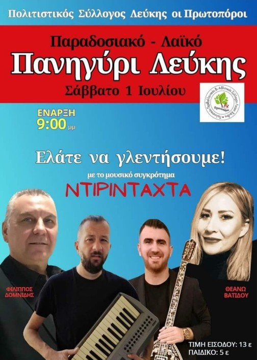 *Επίσης, ο Πολιτιστικός Σύλλογος Λεύκης «Οι Πρωτοπόροι» το Σάββατο 1 Ιουλίου στις 09:00 το βράδυ διοργανώνει στη Λεύκη Ξάνθης ένα παραδοσιακό λαϊκό πανηγύρι με το μουσικό σχήμα «Ντιριντάχτα», με τους Φίλιππο Δομνίδη και τη Θεανώ Βατίδου στο τραγούδι, τον Ανδρέα Μυγδαλά στο αρμόνιο και τον Γιάννη Γαβριηλίδη στο μπουζούκι!