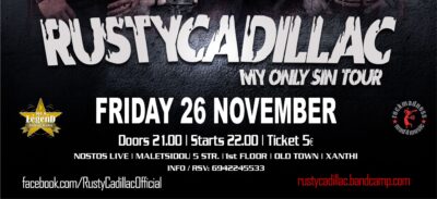 Οι Rusty Cadillac η Heavy Blues-Rock μπάντα της Θεσσαλονίκης , έρχεται στο NOSTOS LIVE στην Ξάνθη την Παρασκευή 26 Νοεμβρίου, για να ξεσκουριάσει παλιές και νέες Blues Rock επιτυχίες αλλά και να παρουσιάσει τα κομμάτια του πρώτου της δίσκου.