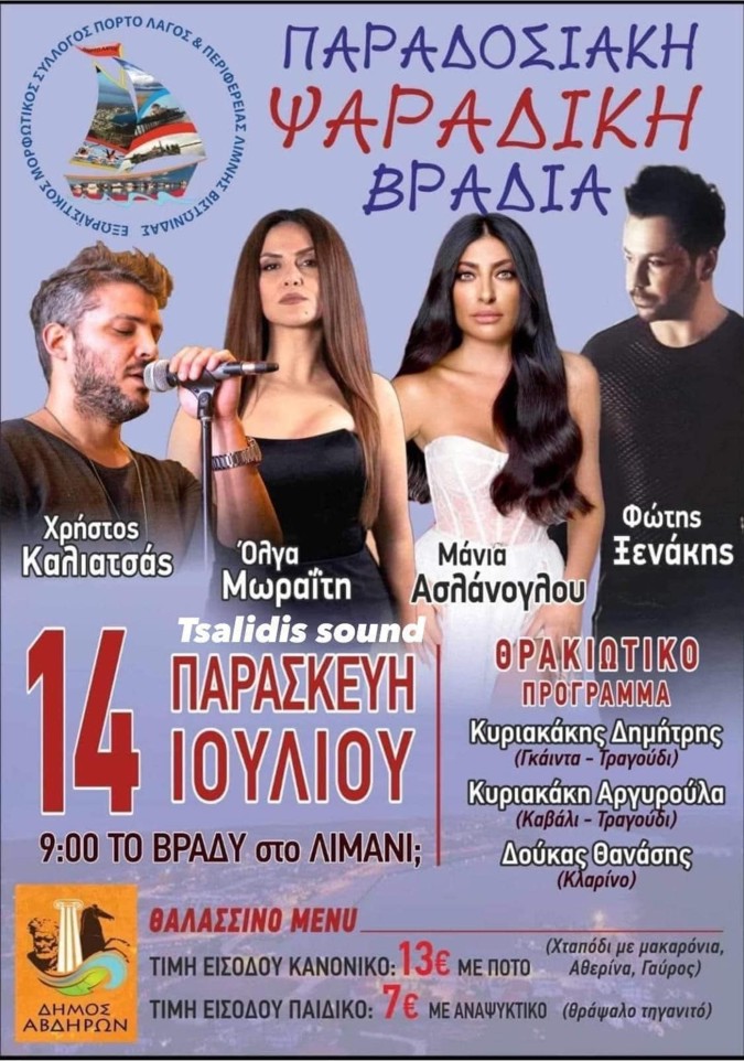 *Την Παρασκευή 14 Ιουλίου στις 9 το βράδυ στο λιμάνι του Πόρτο Λάγος, η παραδοσιακή ψαράδικη βραδιά, με Μάνια Ασλάνογλου, Χρήστο Καλιατσά, Όλγα Μωραΐτη και Φώτη Ξενάκη!