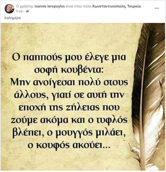 *Στην Κωνσταντινούπολη βρίσκεται ο Γιάννης Ιερόπουλος κι από εκεί έκανε μια… σοφή ανάρτηση στην οποία αναφέρει επί λέξει: