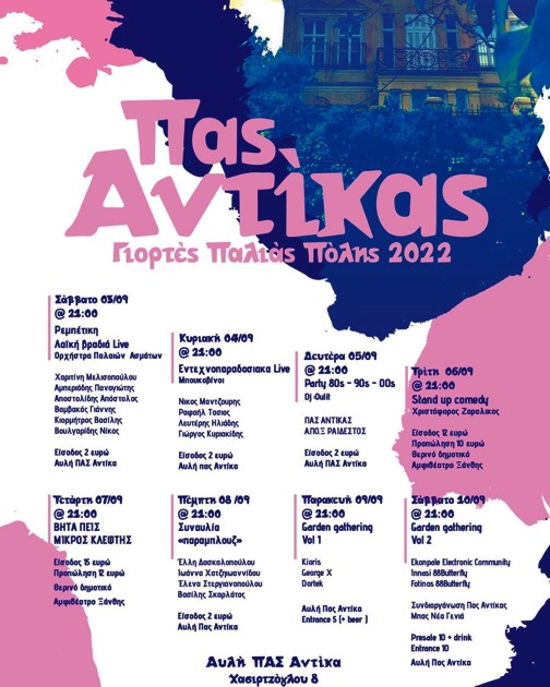 Και αναλυτικότερα:  Ο ΠΑΣ Αντίκας  ανακοινώνει το πρόγραμμα του για τις Γιορτές Παλιάς Πόλης 2022 και προσκαλεί ΄όλους να επισκεφθούν το στέκι του και να απολαύσουν μια σειρά από εκδηλώσεις στην αυλή του συλλόγου (Χασιρτζόγλου 8) αλλά και στο Θερινό Δημοτικό Αμφιθέατρο Ξάνθης με συναυλίες, dj set ,stand up comedy , συνοδευόμενες με δροσερά ποτά και παγωμένες μπίρες .