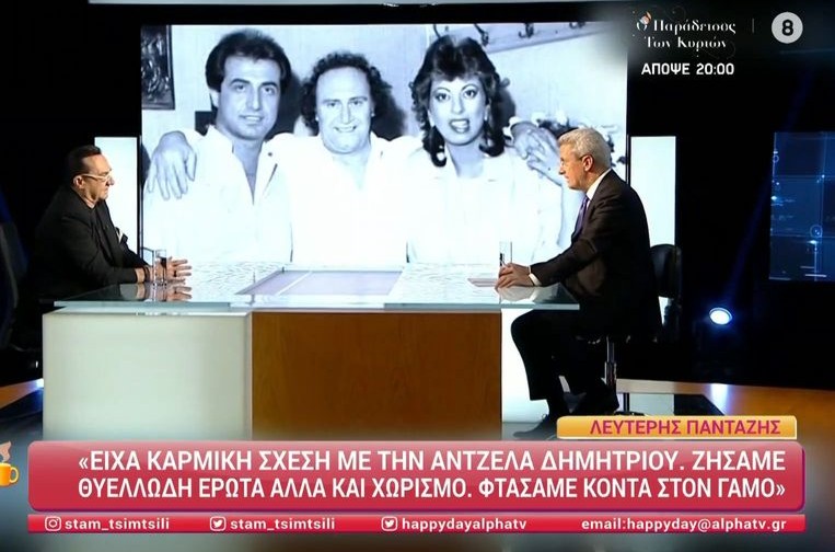 «Υπήρξε μια σημαντική μου σχέση που δεν έγινε γνωστή, ναι. Δεν ξέρω αν το ξέρετε αυτό. Μια κυρία του θεάτρου. Μπορώ να το πω; Ε, τώρα… Εδώ είναι, εν ζωή, την αγαπώ και το λέω με σεβασμό γιατί πέρασα πολύ όμορφα κοντά της», είπε αρχικά ο Λευτέρης Πανταζής.