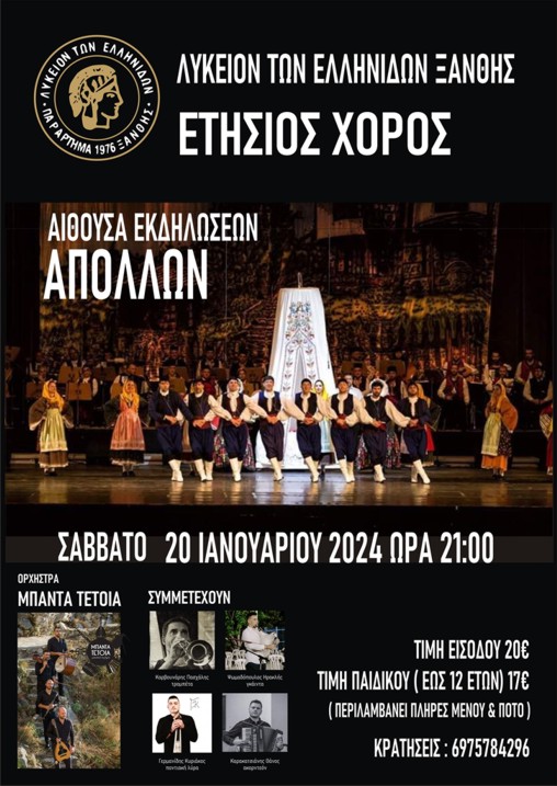 *Τον ετήσιο χορό του έχει το Λύκειο Ελληνίδων Ξάνθης αυτό το Σάββατο 20 Ιανουαρίου 2024 στην αίθουσα Απόλλων στις 9 το βράδυ.