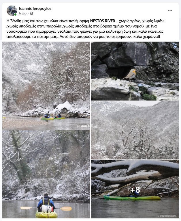 Η Ξάνθη μας και τον χειμώνα είναι πανέμορφη NESTOS RIVER… χωρίς τρένο, χωρίς λιμάνι ,χωρίς υποδομές στην παραλία, χωρίς υποδομές στο βόρειο τμήμα του νομού, με ένα νοσοκομείο που αιμορραγεί, νεολαία που φεύγει για μια καλύτερη ζωή και καλά κάνει… ας απολαύσουμε το ποτάμι μας… Αυτό δεν μπορούν να μας το στερήσουν… καλό χειμώνα!!».