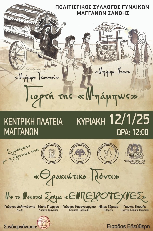 Ο Σύλλογος Γυναικών « Η ΓΥΝΑΙΚΟΚΡΑΤΙΑ» Ν. Κεσσάνης Ξάνθης, σας προσκαλεί στο Γλέντι της «ΜΠΑΜΠΩΣ», την Παρασκευή 10η Ιανουαρίου 2025  και ώρα 17.00 το απόγευμα,  για την αναβίωση του εθίμου στην Κεντρική Πλατεία και στη συνέχεια χορό και φαγητό  στην Πνευματικό Κέντρο.