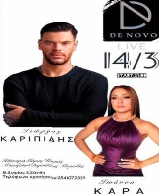Από τώρα οι κρατήσεις στο DE NOVO για το τρομερό live του Γιώργου Καρυπίδη με την μαγική Ιωάννα Καρά την Πέμπτη 14 Μαρτίου στις 8 το βράδυ στο DE NOVO. Κρατήσεις 25410-72319