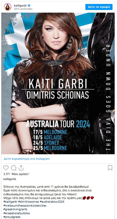 *Πιο αναλυτικά, η Καίτη Γαρμπή έγραψε στην ανάρτηση που έκανε: «Έλληνες της Αυστραλίας, μετά από 11 χρόνια θα ξαναβρεθούμε! Είμαι πολύ συγκινημένη και ενθουσιασμένη, όλη η οικογένεια είναι ενθουσιασμένη που θα ανταμώσουμε ξανά τον Μάιο!!! Μέχρι τότε σας στέλνουμε τα φιλιά μας και την αγάπη μας!»,