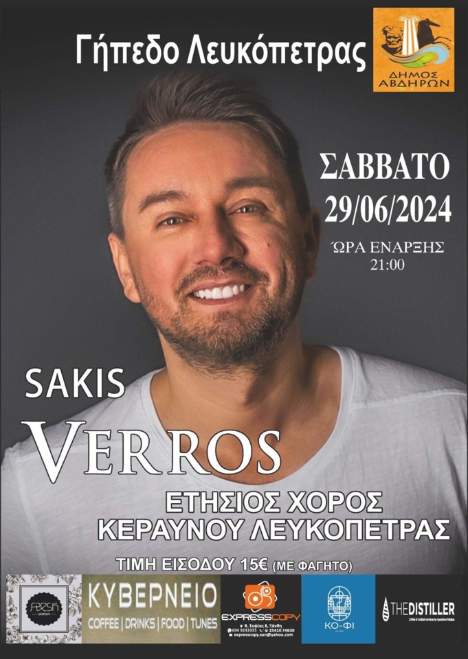 *Και στα δικά μας. Τον κορυφαίο Σάκη Βέρο με την Ορχήστρα του φέρνει η ποδοσφαιρική ομάδα Κεραυνός Λευκόπετρας το Σάββατο 29/6/2024 στις 9 το βράδυ στο γήπεδο της Λευκόπετρας στο χορό του καλοκαιριού με τη στήριξη του Δήμου Αβδήρων.