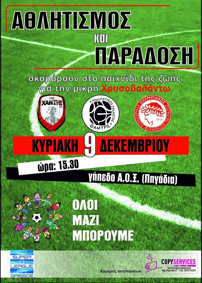 Στα πλαίσια στήριξης ενός ακόμα συμπολίτη μας, της μικρής Χρυσοβαλάντως, οργανώσαμε μια εκδήλωση στα πλαίσια του ποδοσφαιρικού αγώνα Ξάνθης – Ολυμπιακού. (Την Κυριακή 9 Δεκεμβρίου και ώρα 15:30 στο γήπεδο ΑΟΞ στα Πηγάδια)