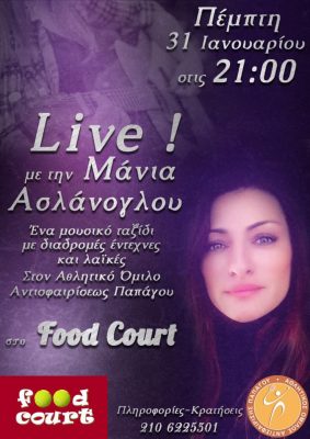 *Αποκλειστικό. Στον Αθλητικό Όμιλο Αντισφαιρίσεως Παπάγου στην Αθήνα και συγκεκριμένα στο food Court θα εμφανιστεί η δημοφιλής Μάνια Ασλάνογλου σε ένα πραγματικά εκρηκτικό και μοναδικό live την Πέμπτη 31 Ιανουαρίου στις 21.00.