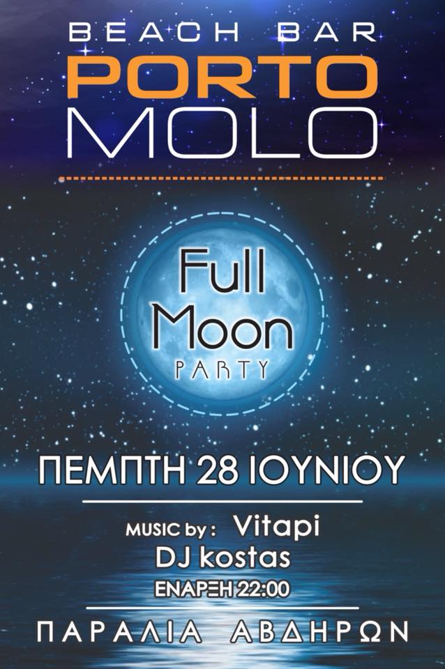 Το Beach Bar Porto Molo στην παραλία Αβδήρων υποδέχεται την Πέμπτη 28/06 την πανσέληνο του Ιουνίου με το πλέον καθιερωμένο Full Moon πάρτι της πόλης. Για να ξεκινήσει με τις καλύτερες προϋποθέσεις η νέα καλοκαιρινή σεζόν, πρέπει να απολαύστε το ποτό, το cocktail ή το φαγητό σας με θέα τη θάλασσα. Music : Vitapi & DJ Kostas