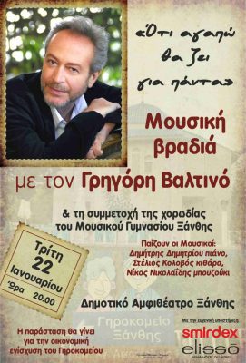 Την Τρίτη 22 Ιανουαρίου 2019 στις 20:00 θα πραγματοποιηθεί μια φιλανθρωπική βραδιά γεμάτη από ήχους και τραγούδια που αγαπήσαμε, με ένα μοναδικό ηθοποιό και ερμηνευτή, τον Ξανθιώτη Γρηγόρη Βαλτινό. Συμμετέχει η χορωδίας του Μουσικού Γυμνασίου Ξάνθης και το συγκρότημα Ναδίρ.