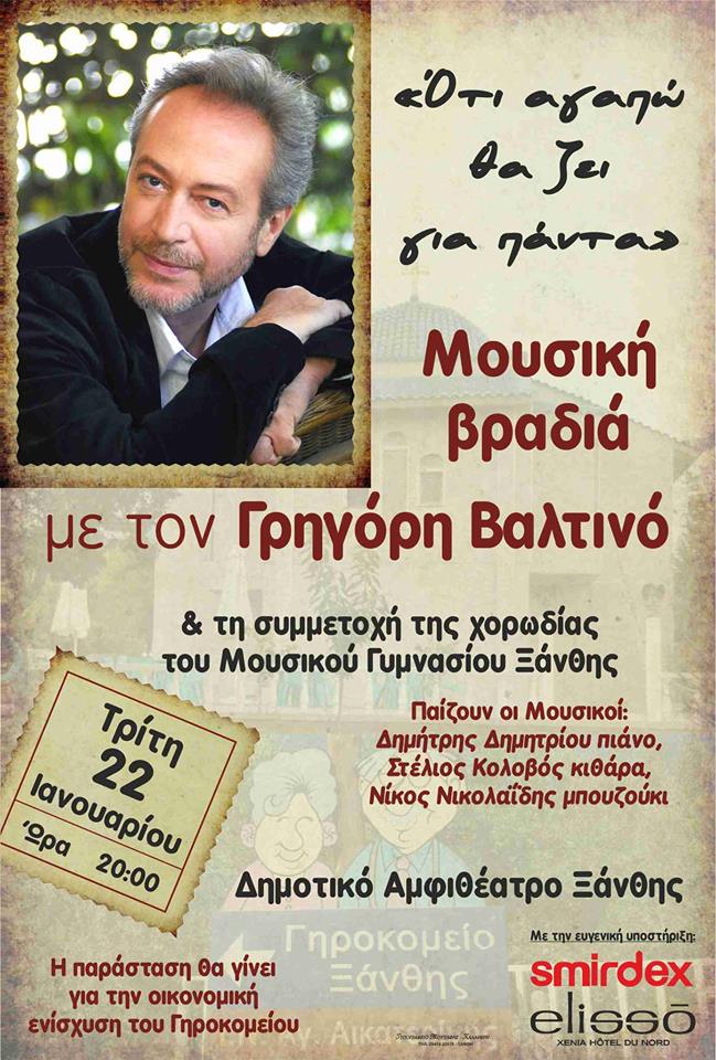 Την Τρίτη 22 Ιανουαρίου στις 20:00 στο Δημοτικό Αμφιθέατρο Ξάνθης η φιλανθρωπική βραδιά του γηροκομείου Ξάνθης γεμάτη από ήχους και τραγούδια που αγαπήσαμε, με ένα μοναδικό ηθοποιό και ερμηνευτή, τον Ξανθιώτη Γρηγόρη Βαλτινό. Συμμετέχει η χορωδίας του Μουσικού Γυμνασίου Ξάνθης και το συγκρότημα Ναδίρ.