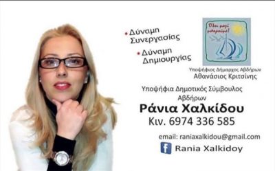 *Αποκλειστικό 2. Η πολύ αγαπημένη μου φίλη και ειλικρινά εξαιρετικός άνθρωπος, η Ράνια Χαλκίδου, κόρη του μαχητικού Σπύρου Χαλκίδη από το Νέο Ζυγό, κατεβαίνει υποψήφια δημοτική σύμβουλος με το ψηφοδέλτιο «Όλοι μαζί μπορούμε», του υποψήφιου Δημάρχου Αβδήρων Αθανάσιου Κριτσίνη.